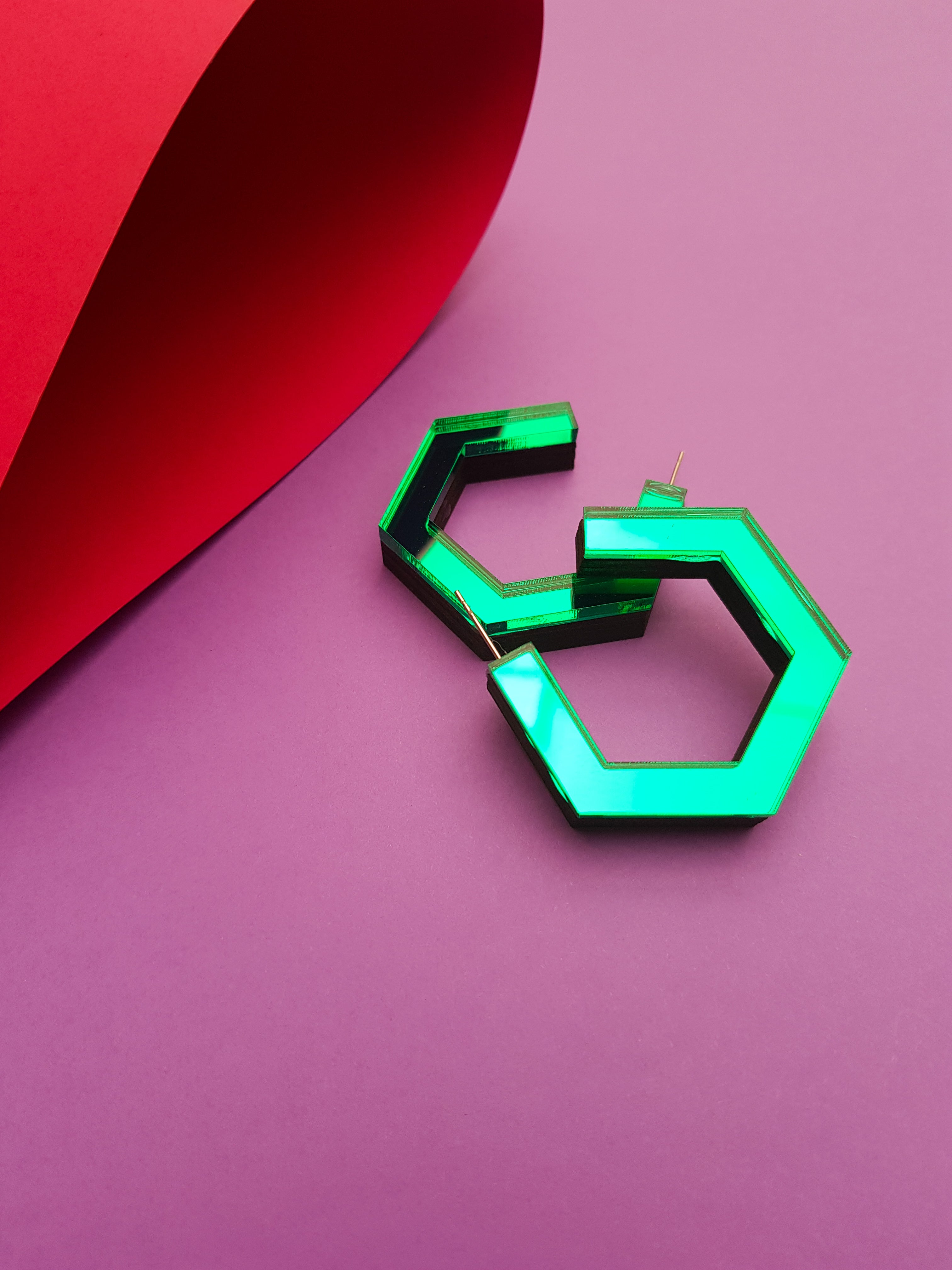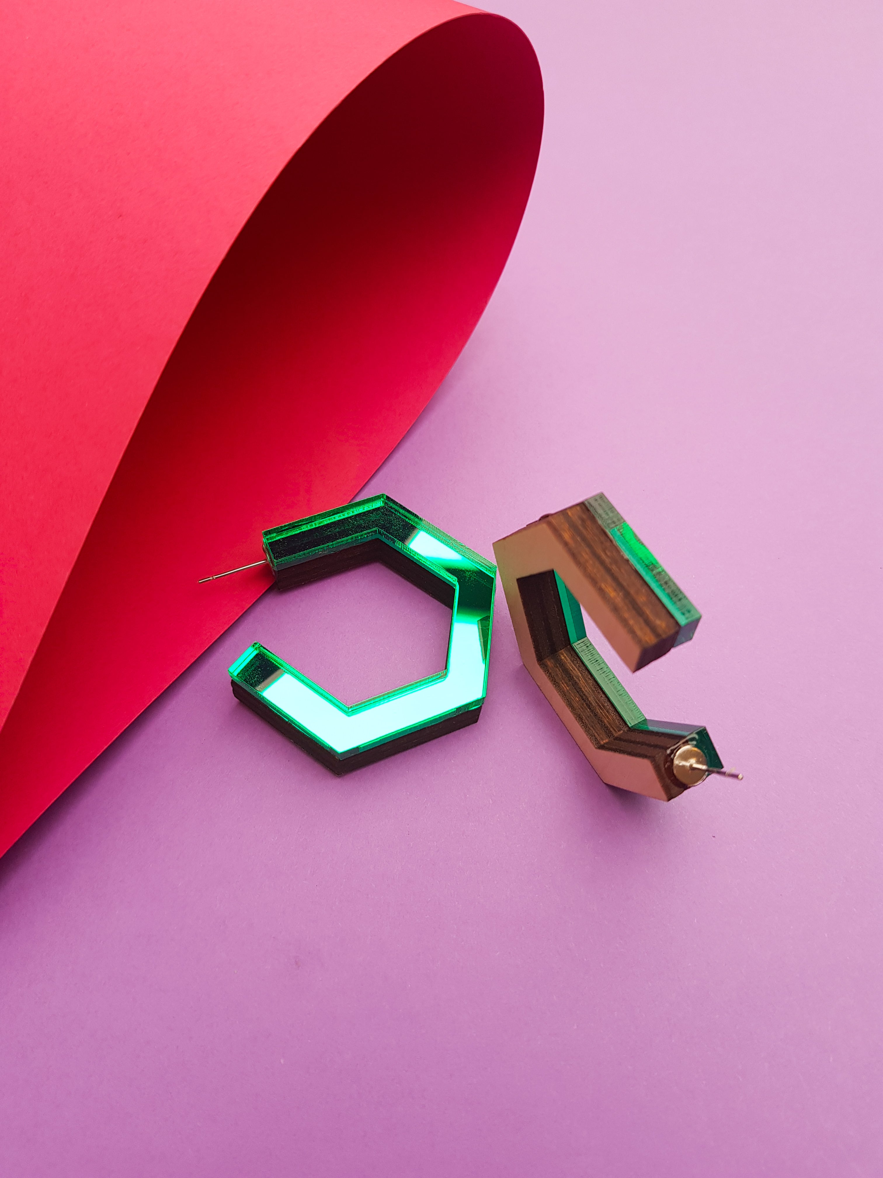 Green hexagonal ply and perspex hoop earrings