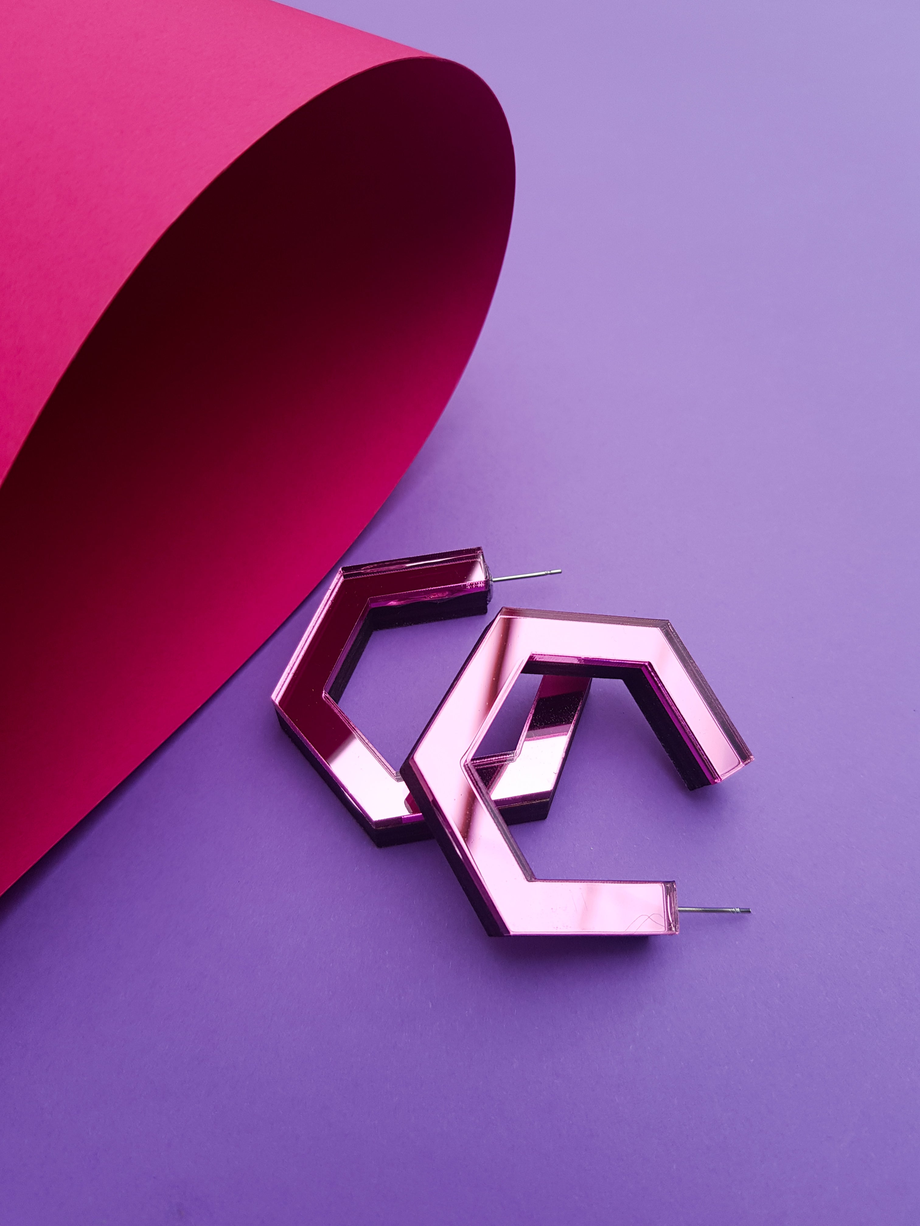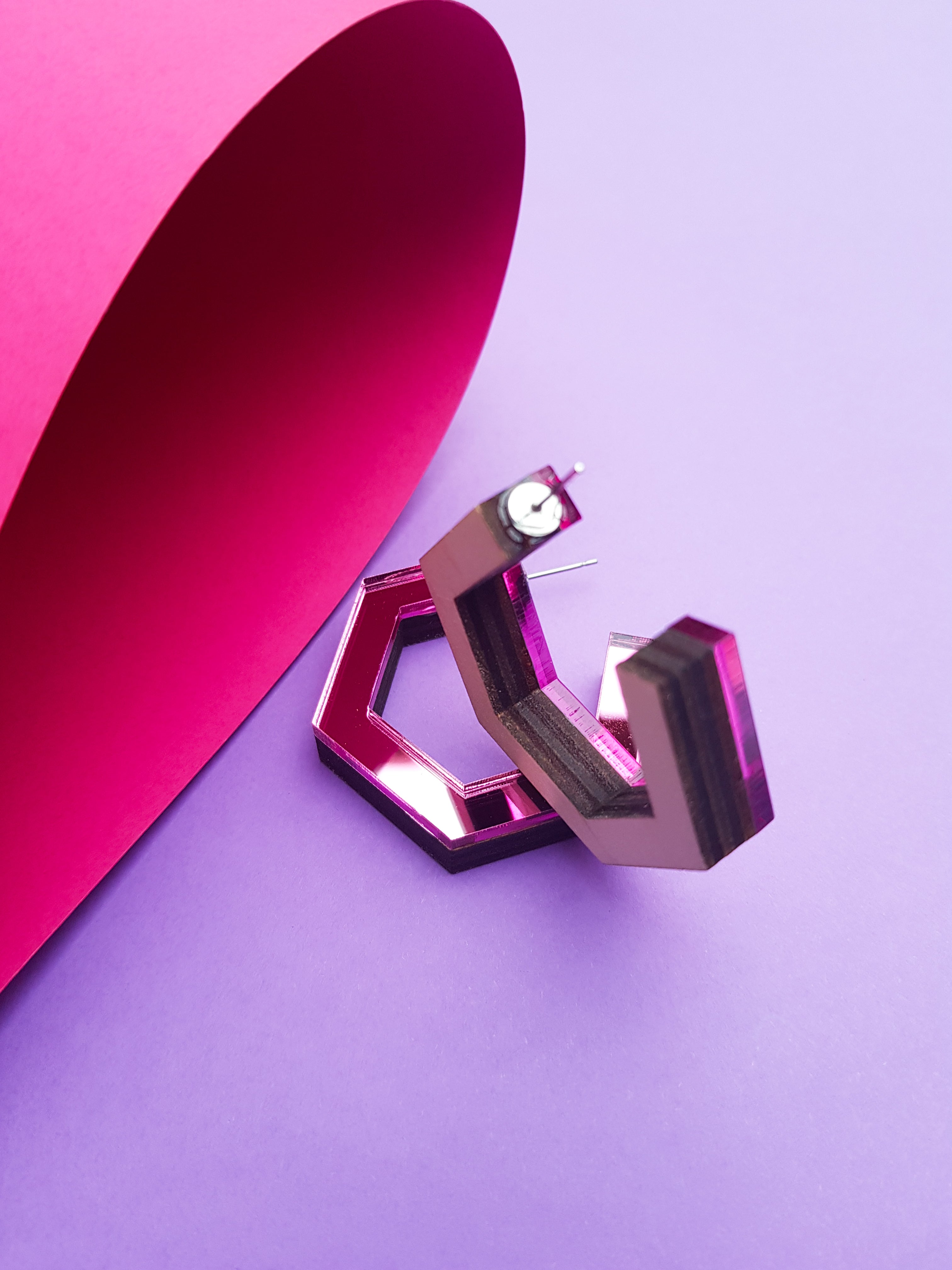 Pink hexagonal ply and perspex hoop earrings