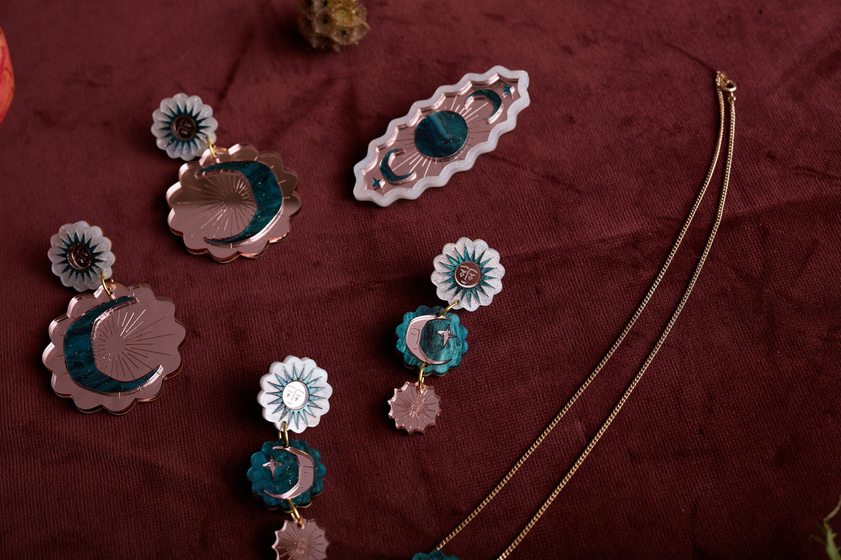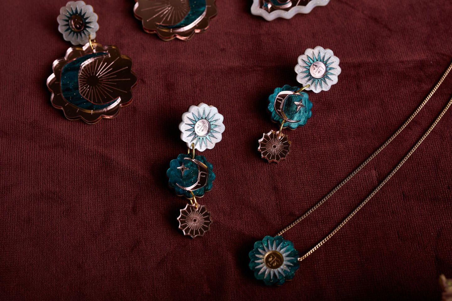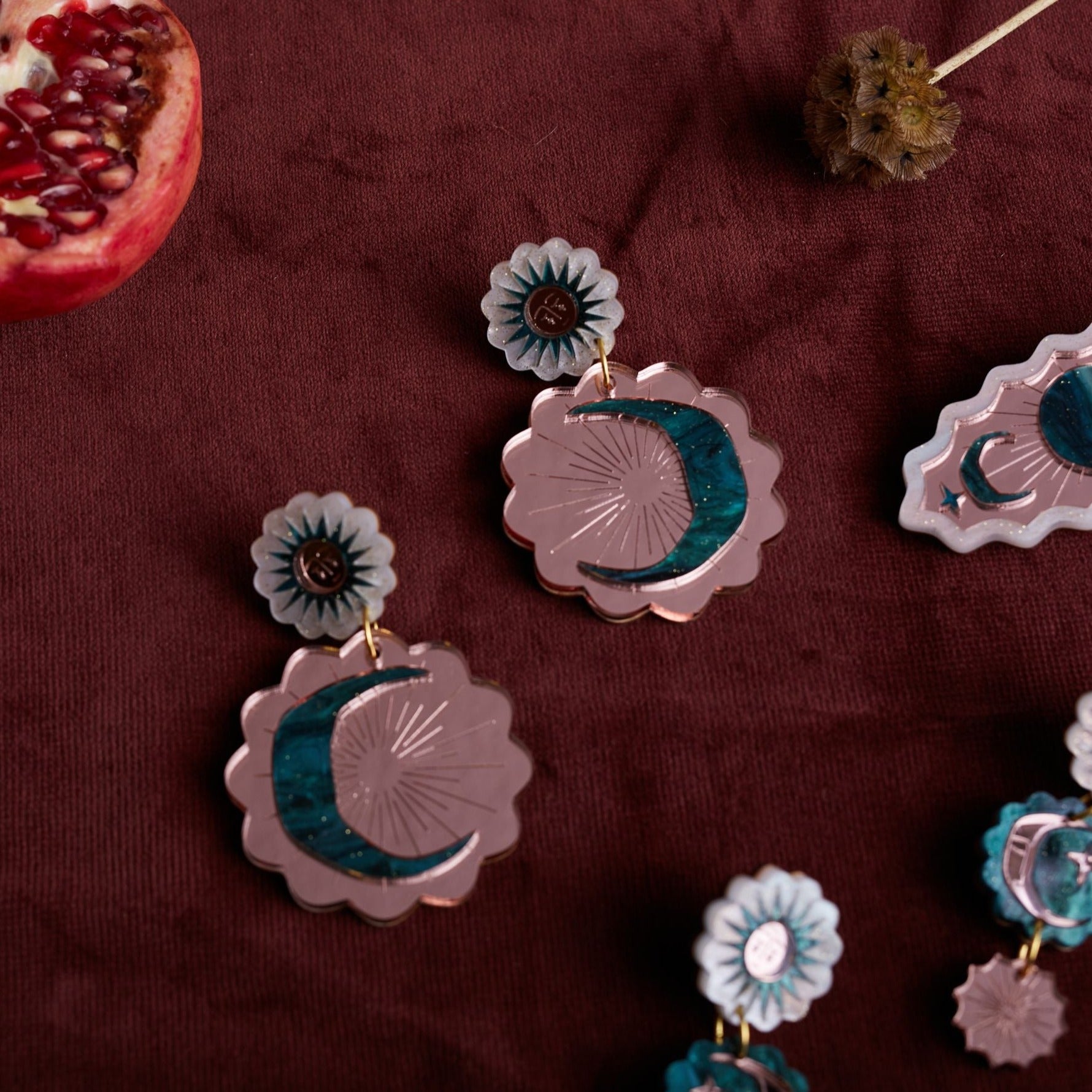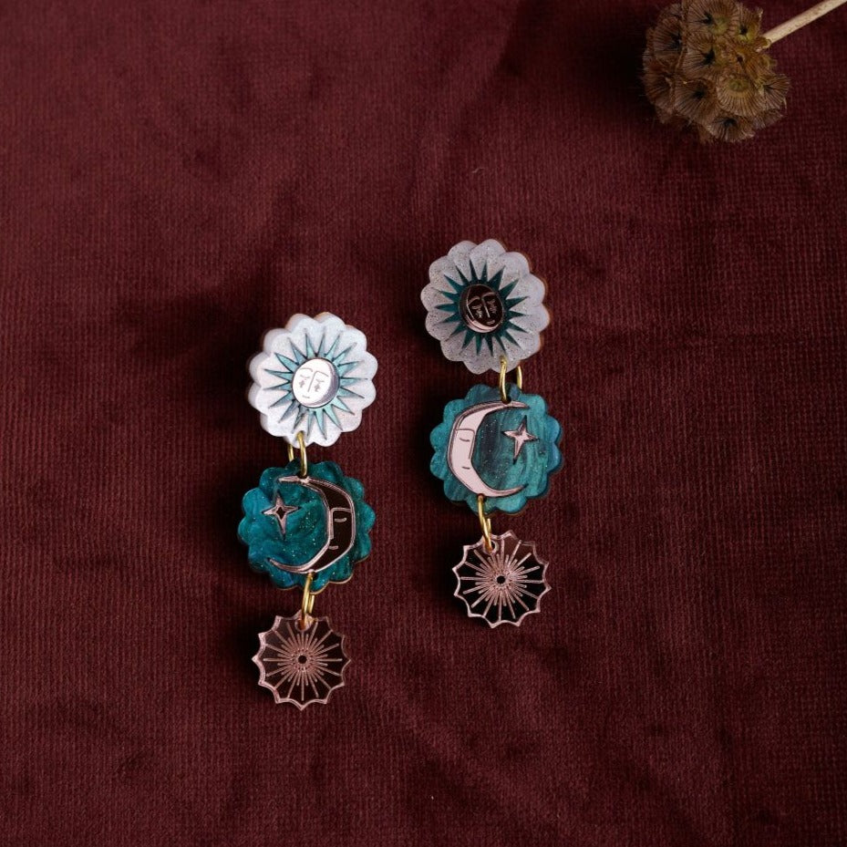 Celestial Statement Sun Moon Stud Earrings- Teal